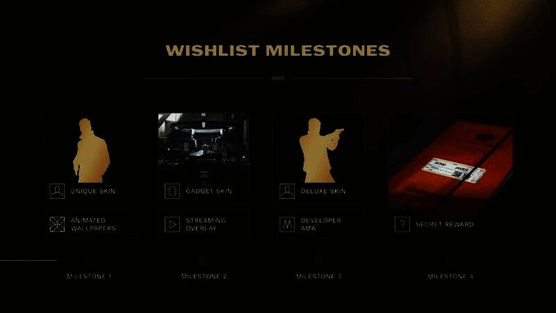 活动共设四个里程碑目标。玩家需在Steam、Epic 、Xbox商店、PlayStation商店及任天堂 eShop等数字平台将《007:曙光》添加至愿望单,当加入人数累计达到特定数量时,即可解锁对应层级的奖励。