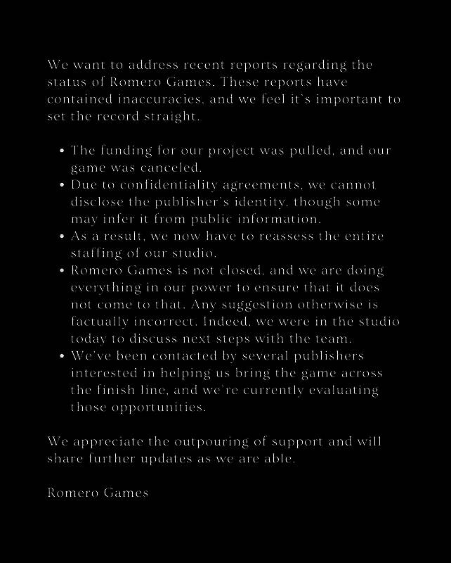“任何与此相反的说法都是不实的,”罗梅罗游戏写道。“事实上,我们今天还在工作室与团队商讨下一步计划。”