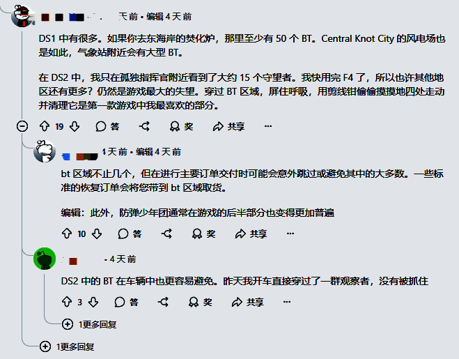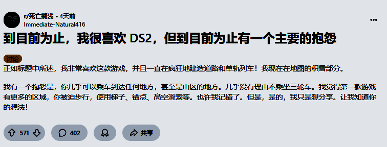 这一被热议的“关键点”是行走体验。在Reddit论坛上,有玩家发帖表示,尽管非常喜欢《死亡搁浅2》,但他认为游戏的一个“主要问题”是过于依赖载具。他指出,相比第一部作品,续作中的多数区域都可以通过摩托或卡车轻松抵达,几乎无需使用攀爬工具或步行。该观点引发大量共鸣,许多玩家跟帖表示同感,认为第二部作品在地形挑战性、BT敌人数量和环境事件紧张感方面都不及前作。