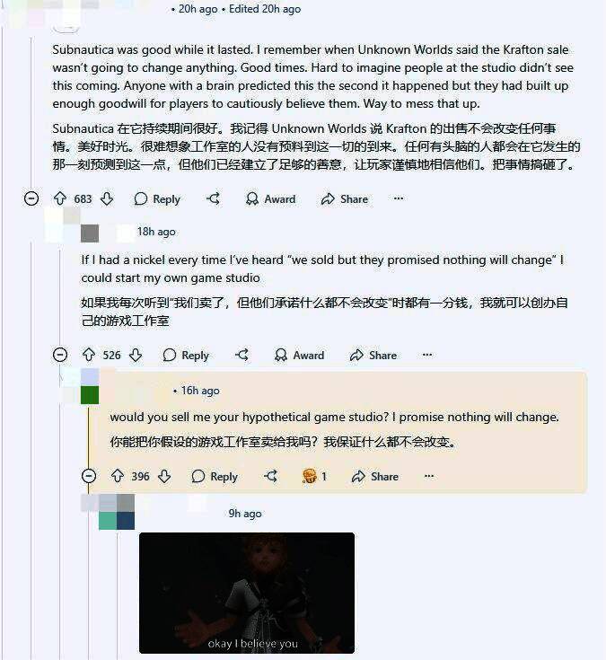 这番“玩家至上”的宣言颇具讽刺意味——2018年问世的初代《深海迷航》正是Unknown Worlds在脱离Krafton时独立完成的。消息公布后,愤怒的玩家们迅速占领Reddit论坛,宣称该项目“已经完蛋”。