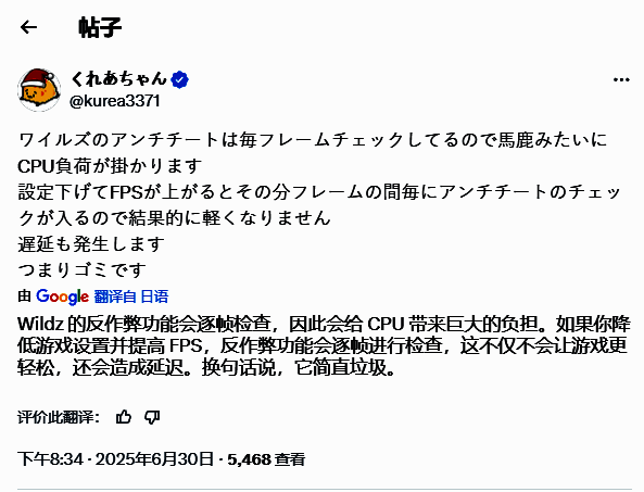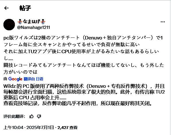 虽然游戏此前就存在类似问题,但第二弹更新后情况明显恶化。据多名日本玩家实测,当《怪物猎人:荒野》在后台运行时,反作弊系统会对每一帧画面进行违规检测,导致CPU负载激增,甚至可能造成硬件损伤。即便玩家调低画质设置试图提升性能,帧间触发的反作弊检测也会让这些优化措施收效甚微。