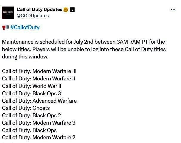 动视宣布今日将对十款《使命召唤》系列游戏进行为期数小时的维护,期间游戏服务将中断,但未透露具体原因。本次维护涉及的游戏阵容庞大,甚至包含2009年上市的《现代战争2》。官方强调维护窗口将持续四小时,期间所列游戏将无法运行。