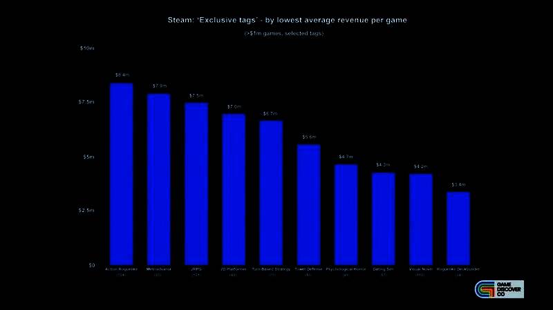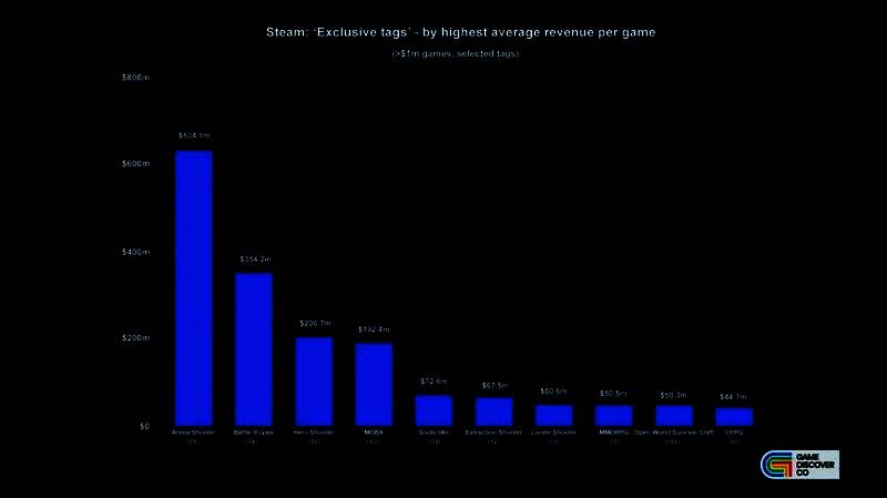 调研机构GameDiscoverCo近期针对Steam市场的实际规模(总可触达市场/TAM)展开研究,通过为每款收入超百万美元的游戏仅保留两个核心标签(主类型+子类型)的实验方法,得出关键结论:Steam平台四分之三游戏收入来自动作与RPG类型