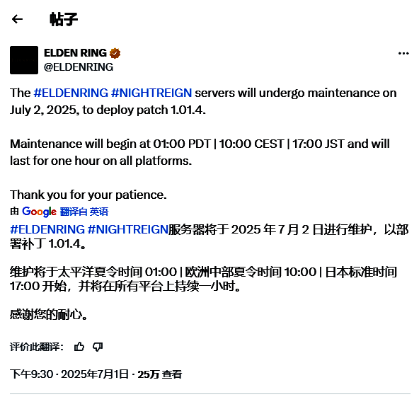 FS社宣布旗下联机肉鸽游戏《艾尔登法环:黑夜君临》将于北京时间7月2日下午16:00至17:00进行为期1小时的服务器维护维护,为1.01.4版本更新做准备。