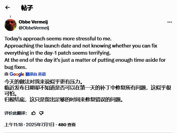 他进一步解释道:"临近发售日却不确定能否通过首日补丁解决所有问题,这种状态简直令人窒息。说到底,关键是要为漏洞修复预留充足时间。"这一独特视角揭示了本质差异:过去是完成最终版本后彻底解脱,现在则是直到发售最后一刻(甚至发售后)都要持续应对各种问题。