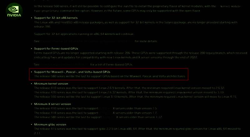 英伟达宣布,在580驱动之后(可能是590分支),不再为GTX 700(Maxwell),900(Maxwell)和1000(Pascal)GPU提供驱动支持。从英伟达580驱动开始,这三代GPU将获得最后一次驱动程序更新。