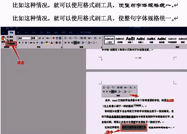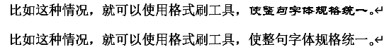 有时因为设置不当会导致文字的字体规格出现不一致的情况,这时只需点击鼠标左键并拖动鼠标选中想要呈现的字体规格的文字,点击格式刷,当你的鼠标显示成一个小刷子的图标时,再同上步选中与期望字体规格不一致的文字。
