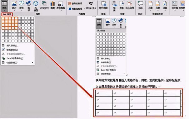 横向的方块就是想要插入表格的行,同理,竖向就是列。鼠标轻轻放上去所显示的方块数就是你想插入表格的行列数,当鼠标移至插入的表格行列,点击鼠标左键就可生成所需表格。