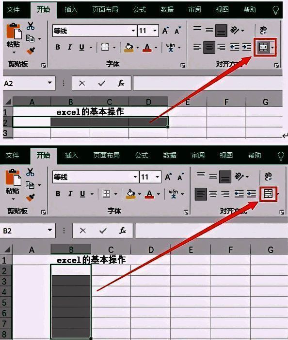 在这里可以看到“excel的基本操作”这句话所处表格与其他表格的规格不一样,这是因为使用了合并表格,就是将所选表格合并成一个表格。