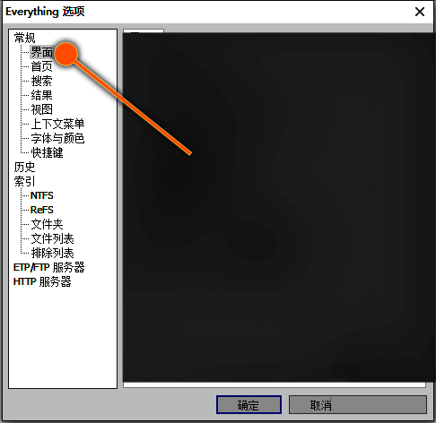 第二步:在“Everything 选项”界面中,点击“常规”面板中的“界面”列表项。