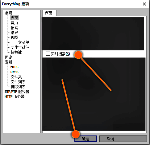 第三步:在“界面”列表项中,勾选“实时搜索”选项的勾选开关,点击“确定”按钮。