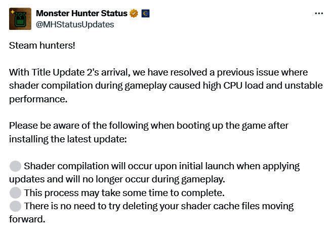 此外,《怪物猎人》客服官推确认第二次更新还解决了“在游玩过程中因着色器编译导致的CPU高负载和性能不稳定问题”。