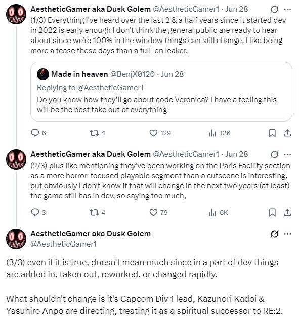 近日爆料人Dusk Golem透露了《生化危机:代号维罗妮卡》重制版新情报。他表示该作自2022年起由卡普空第一开发部负责主导开发,《生化危机2:重制版》总监门井一宪和安保康弘共同执导,他们将其视为《生化危机2》精神续作。