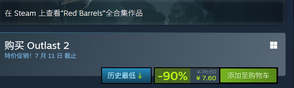 第一人称恐怖游戏《逃生2(Outlast 2)》在最近的Steam夏季特卖中开启了新史低促销,原价76元,目前一折特惠,售价7.6元,为历史最低。