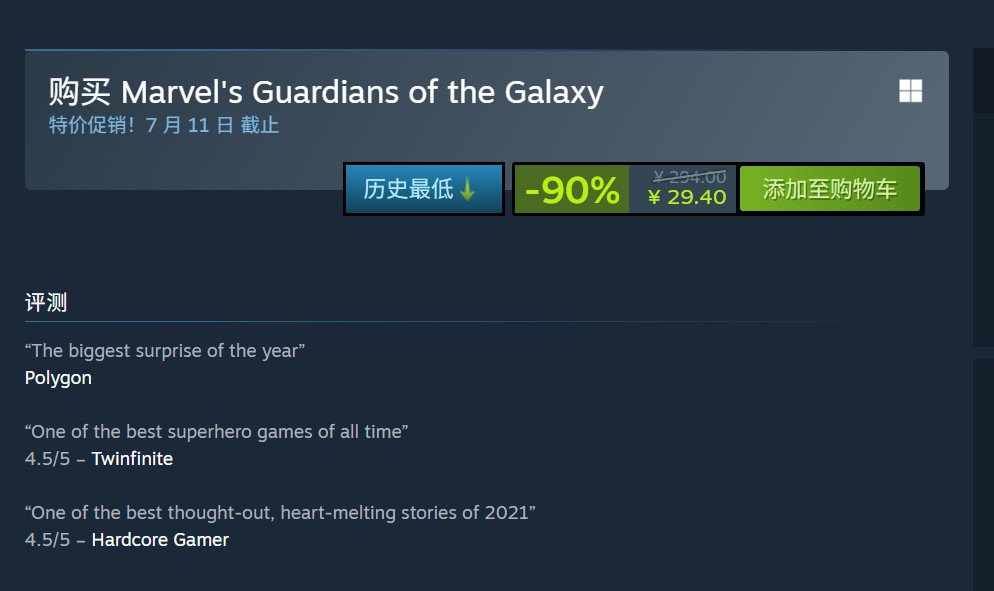 此外,《漫威银河护卫队》也在Steam夏季特卖期间开启了新史低促销,同样也是一折,仅售29.4元。
