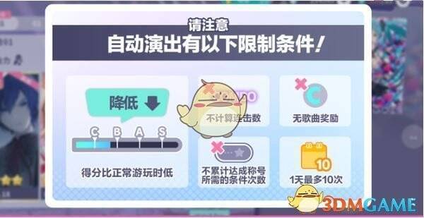 2、自动演出时画面右下角会显AUTOLIVE,自动演出的成绩与COMBO数不会被记录,得分比正常游玩时低,不累计达成称号所需的条件次数,只可获得过关的掉落奖励,无歌曲奖励。