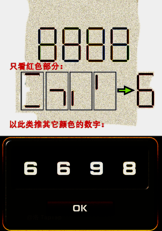 8.将【6】中【纸条】上同颜色的壁画提取出来组成数字,可以得到【绿6,红6,蓝9,黄8】;打开门,进入小房间