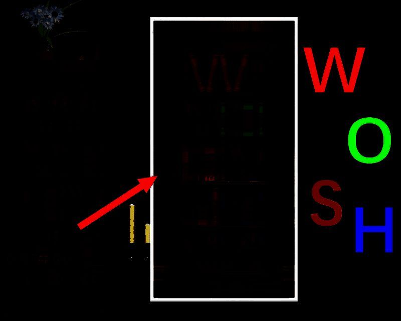35.点击女巫右后方柜子的右侧门,将【34】中获得的【红S-蓝H-绿O-黄W】输入机关;打开柜门,获得【骷髅头3】