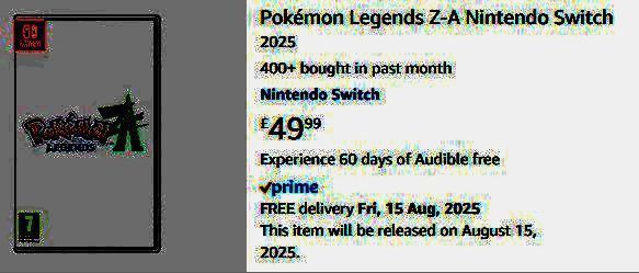 近日,英国亚马逊突然将《宝可梦传说Z-A》的预购发售日期标记为了2025年8月15日,如果一款游戏没有发售日期的话,那么其默认的日期应该是2025年12月31日(占位符)。目前,该页面已经恢复至了默认的2025年12月31日,考虑到英国亚马逊与任天堂关系良好,它们提前获得游戏发售日期的可能性并不小。