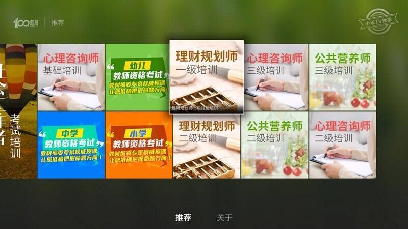 100职业教育是100教育精心打造的电视盒子应用产品,涵盖职称英语、MBA、心理咨询师、理财规划师、公共营养师等多个门类,方便用户在电视上观看100教育的优质课程。