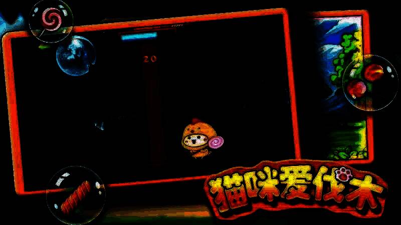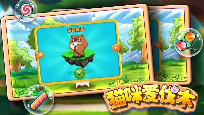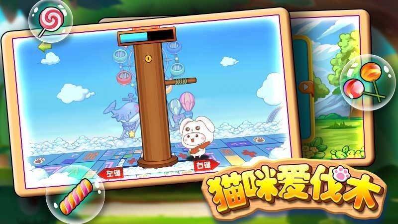 1、操控屏幕里的猫咪快速挥动斧头砍树,同时注意躲避突然出现的树杈。