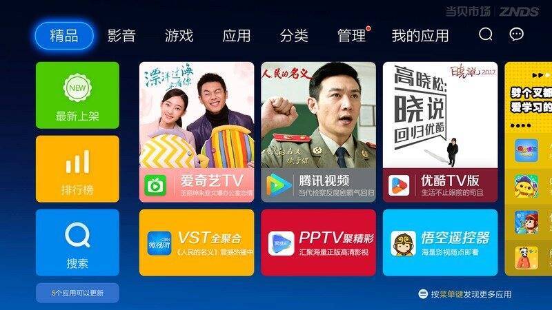《当贝市场TV版》由ZNDS智能电视网出品,是一款智能电视应用市场。它采用全新程序框架与界面设计,能让用户轻松下载各类电视应用和游戏,带来超棒的下载体验。