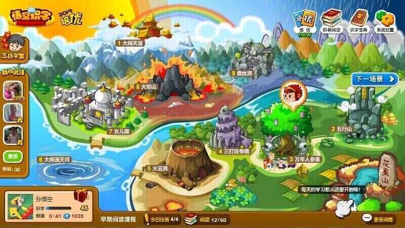 3、以西游记为故事背景,15大场景、120多个识字游戏、1200个识字动画;
