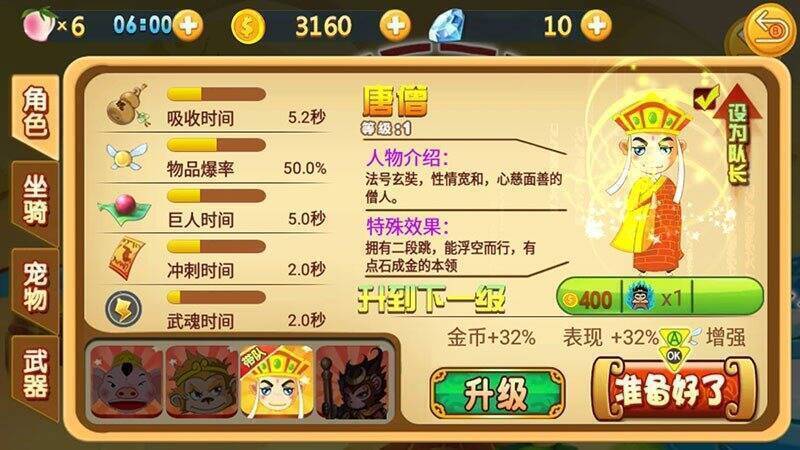 1、西游题材的动作跑酷游戏,有经典原版角色和齐全道具助力闯关,能和西游小伙伴一起奔跑;2、可收集路上的金币、材料来升级人物和购买道具;3、各种宠物、坐骑、武器相伴,助你打败大BOSS;4、丰富道具帮你打败妖怪、脱离险境,合理利用道具能让你战无不胜。