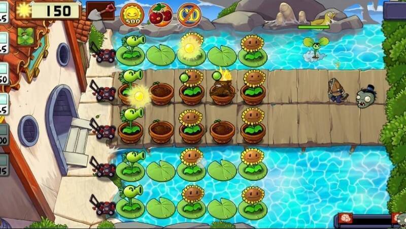 除原版49种植物外,新增火焰玉米投手、寒冰卷心菜等原创植物,需通过任务或成就系统解锁。玩家要根据僵尸特性(如灵符僵尸、渔夫僵尸)调整防御策略,结合场景机制(如龙宫水域、长城迷雾)制定战术。