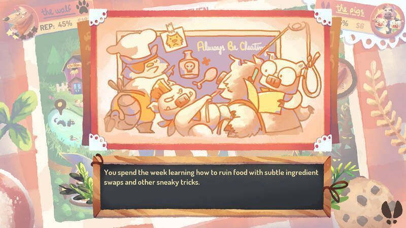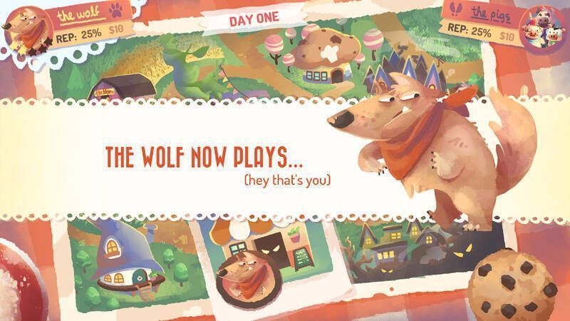 这是一款一对一的冒险游戏,受“三只小猪”等故事启发,玩家要阻碍对手推进自己的议程,可扮演专业餐馆老板或复仇破坏者进行竞争。大灰狼在住宅拆迁行业受挫后转行餐饮业,而三只小猪正密谋阻止其新餐厅“狼咬”开业,大灰狼能否成功成谜。