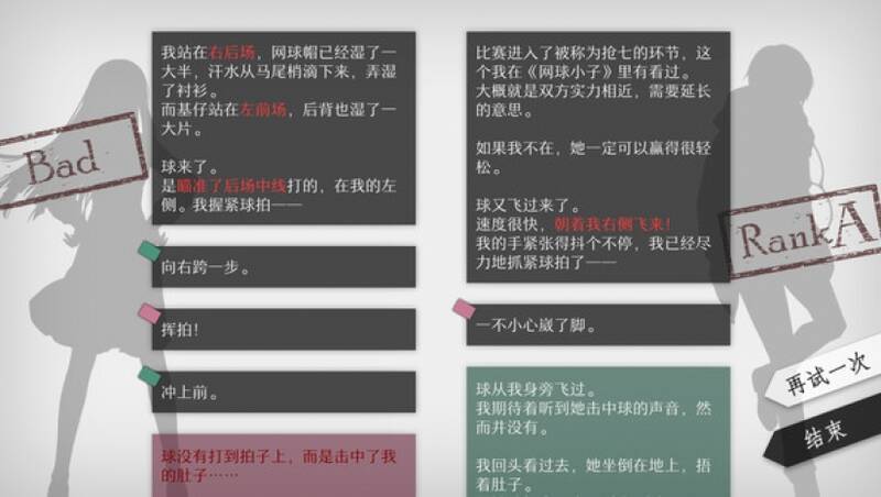 剧情结果设有从“S”到“Z”等多种评级。通常情况下,只有达到“S”评级才算通关,才能解锁后续故事。不过,游戏进行到中段,也会出现只有打出“Bad”评级才能推动剧情发展的情况。